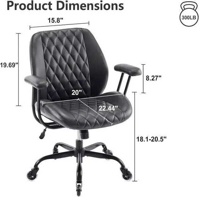 : The office desk chair seat width is 22 inches, the depth is 20 inches, and the height of the armrests is 8.3 inches. The seat height and reclining function can be easily adjusted