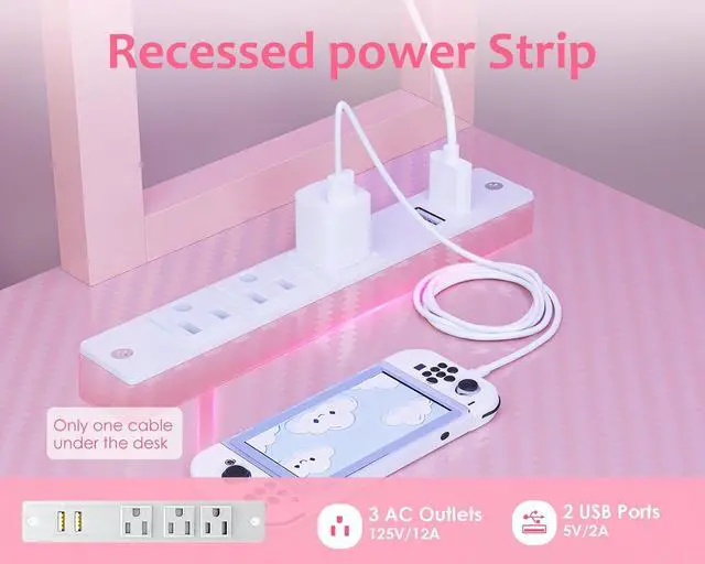 Built-in USB Charging Ports & Power Outlets Equipped with 3 AC outlets and 2 USB ports, providing centralized power access for desktop equipment and mobile devices. Cable management channels maintain workspace organization during extended gaming sessions or work hours.