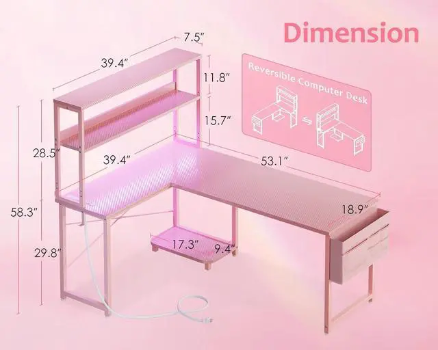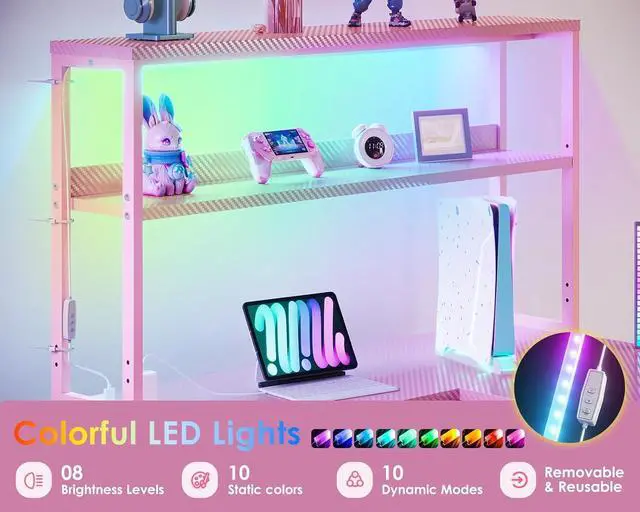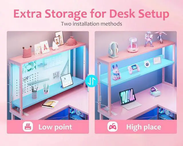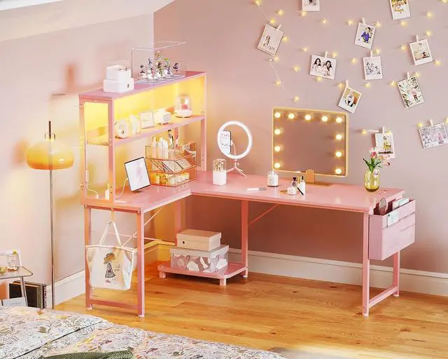 ODK 53 Inch L Shaped Desk with LED Lighting, Reversible Gaming Desk with Power Outlets, Cornor Computer Table with Storage Shelves & Bag & Iron Hook, Home Office Table for Writing, Study, Pink