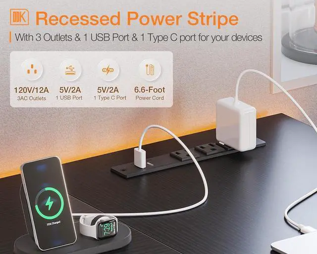 Power Outlets & Charging Ports ODK L shaped computer desk is equipped with 3 Power outlets & 1 USB charging port & 1 Type-C port for electronic devices, you can easily and conveniently charge your smart phone, gaming gear or Bluetooth devices when you are working or playing games.