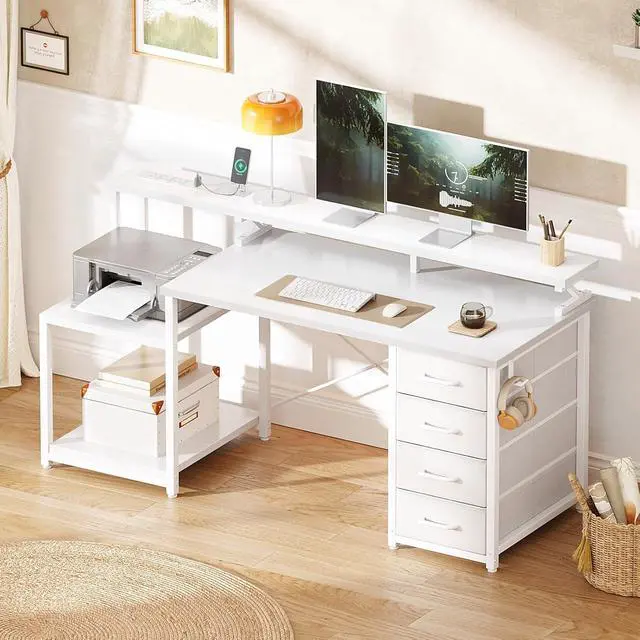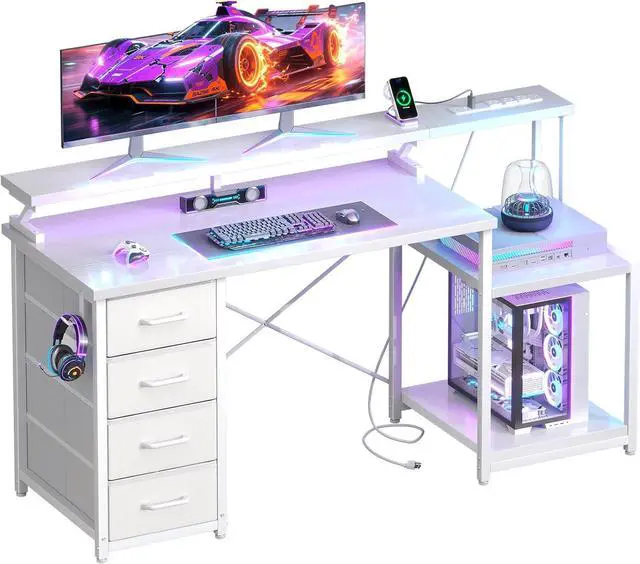 ODK 55 Inch Gaming Computer Desk with Power Outlets and 4 Drawers, Large Home Office Desk with Monitor Stand, Printer Shelf and Storage Shelves for Gaming or Bedroom Setup, White