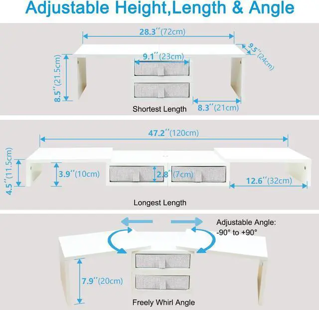 Adjustable Height, Length and Angle: 2 Heights: 4.5/8.5, Length Range: 28.3-47.2, Angle : -90° to +90°, which can meet your different work needs. If you want to add equipment later, you can easily put it down.