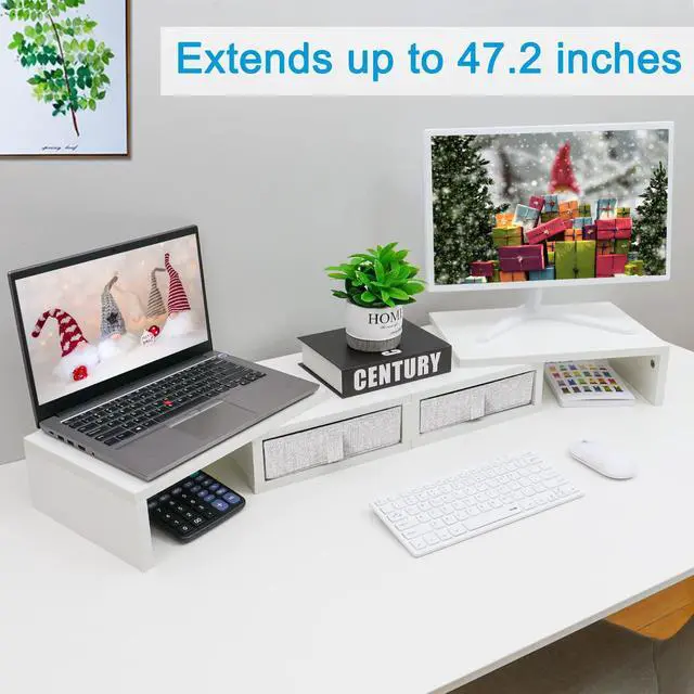 Dual Monitor Stand Riser with 2 Drawers - White Length and Angle Adjustable Monitor Stand with Storage Large Computer Monitor Stand for 2 Monitors/Laptop/PC, Wood Screen/TV Stand Desk Organizer