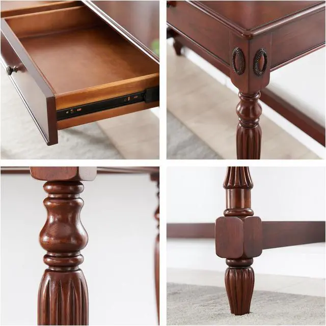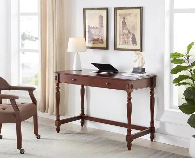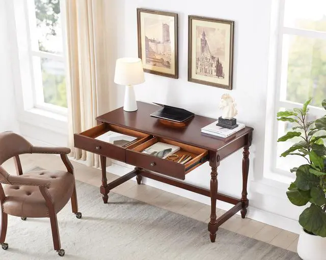 STURDY AND STABLE: Solid rubber wood frame and carved legs give you promise for durability and stability. It can hold up to 250lbs. The 2 big drawers provide enough storage space for small object. Classic cherry red finished make it not only a desk but also a home decoration artwork.