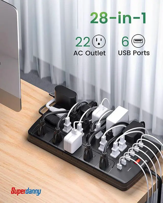 Surge Protector Power Strip with USB, SUPERDANNY Extension Cord with 22 Outlets & 6 USB, 1875W/15A, 1050J Surge Protection, 6.5Ft Flat Plug Power Cord, for Home Office Dorm Workshop, Black