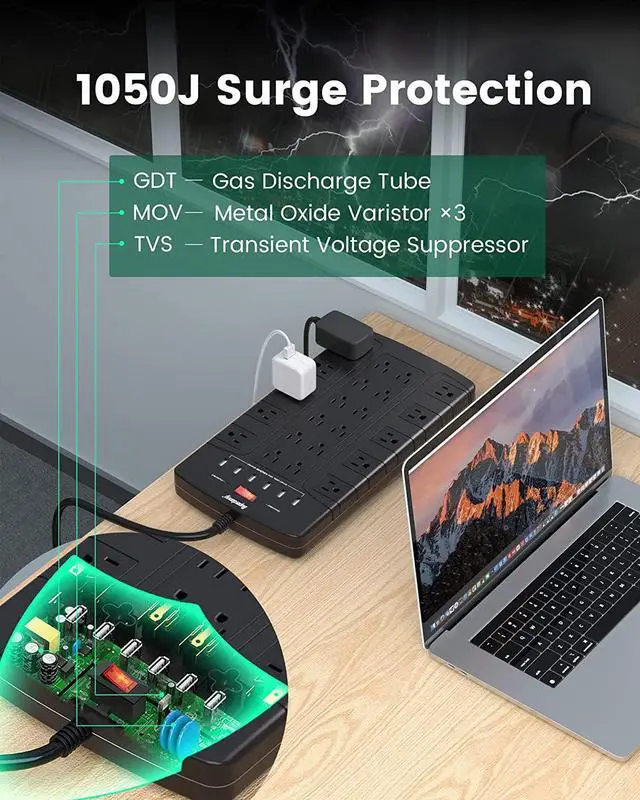 Built with 1050 joules surge protection, along with many other protecting features, this surge protector power strip with usb guards your valued devices wherever it is used.