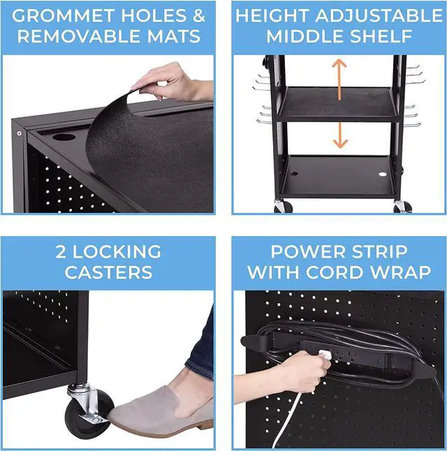 Keep your devices fully charged on-the-go. An integratedthree-outlet UL/CSA listed power stripwith cord wrap paired with grommet holes on each shelfmake it easy to manage messy cords.