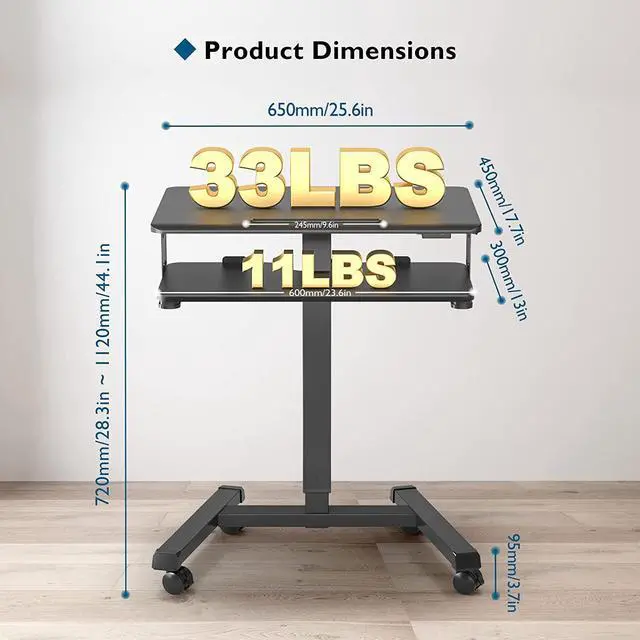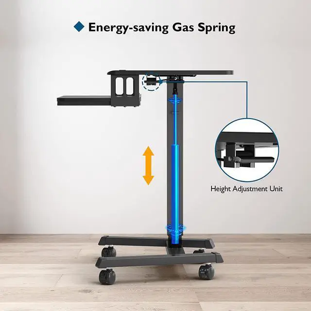Easy to Operate: Our mobile standing desk can be set at any height. When adjusting the height upwards, press the lever with your hand and you can feel the upward force by the pneumatic spring inside the column and release the controller at your desired height. When adjusting downwards, press the lever with your hand and press the desktop at the same time.
