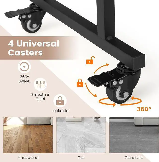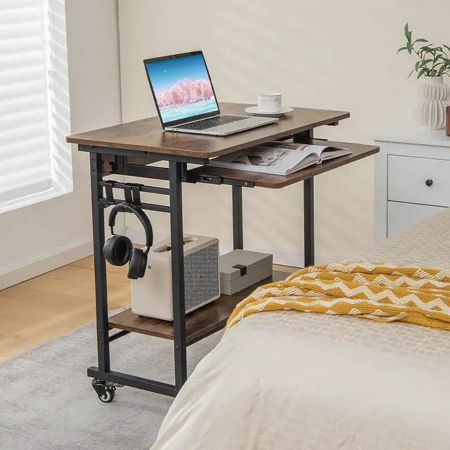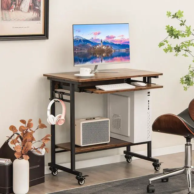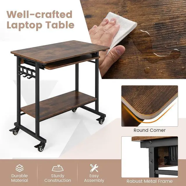Maximize your space with our versatile and stylish mobile computer desk! Measuring 31.5"L x 19.5"W x 31"H, this sleek and compact desk is perfect for tight corners in your home or office. Whether you need a productive work or study space, this desk has you covered. Plus, it can always keep everything organized with ample storage options, with a convenient pull-out keyboard tray, 3 removable hooks, and a bottom storage shelf to free up the tabletop space. And the laptop cart is easy to move & lock with its 4 universal casters.