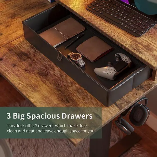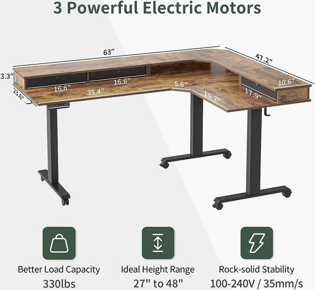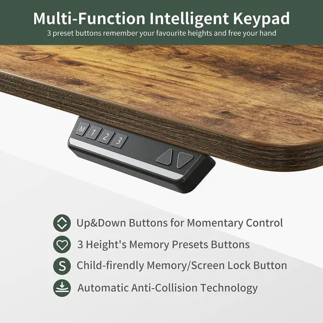 Powerful Electric Lift SystemThe height adjustable desk has 3 preset buttons to customize your desired heights from 27" to 48" with collision-avoiding feature. Contained an industrial-grade steel frame that able to support up to 330 lbs.