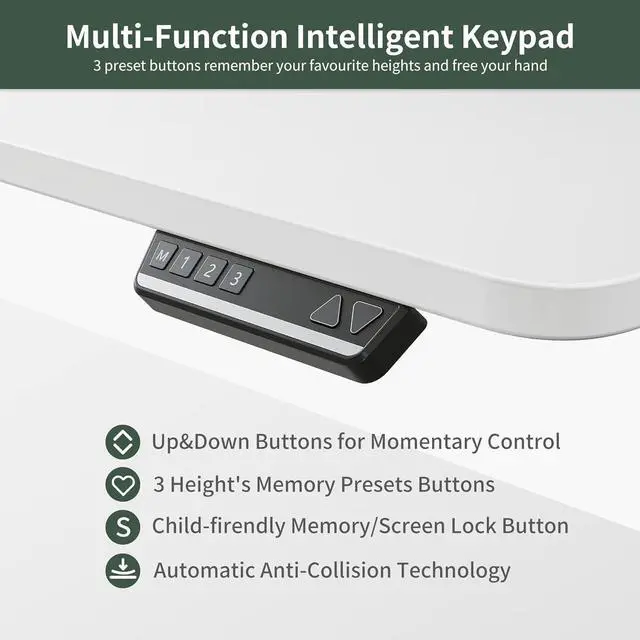 Powerful Electric Lift SystemThe height adjustable desk has 3 preset buttons to customize your desired heights from 27" to 48" with collision-avoiding feature. Contained an industrial-grade steel frame that able to support up to 330 lbs.