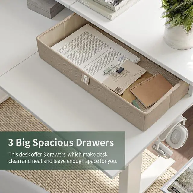 Elegant WorkspaceThe 63" L-shaped large work surface provides ample room, and 3 desktop drawers help you collect orderly.