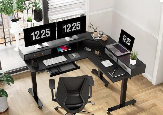 Elegant Workspace: The standing desk L shape large work surface measuring 63" x 55" provides ample room. and drawers help you collect orderly.