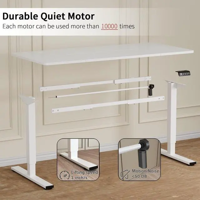 The desk legs are box frame structured, though it is made of steel material, it is not that heavy, offering much stableness and sturdiness in use. There are feet at the bottom of the desk legs, to balance the desk on ground. The wide T-shaped foot design makes the table maintain good stability even when used at the highest height.