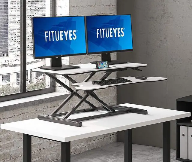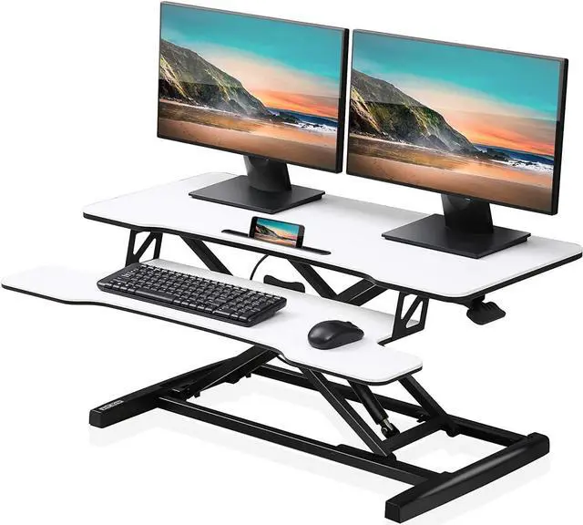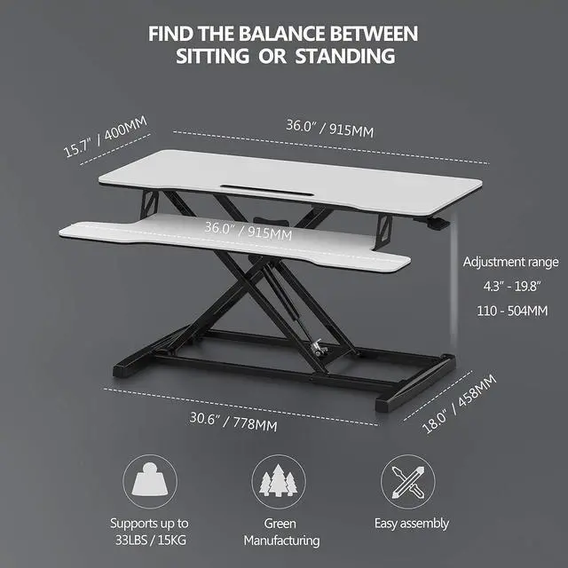 The top surface measures 36 x 24.2 providing plenty of space for single monitor, dual monitor, and laptop + computer monitor setups. Raises up to 19.8 inches and lowers down to 4.3 inches making this ideal for you no matter your height.
