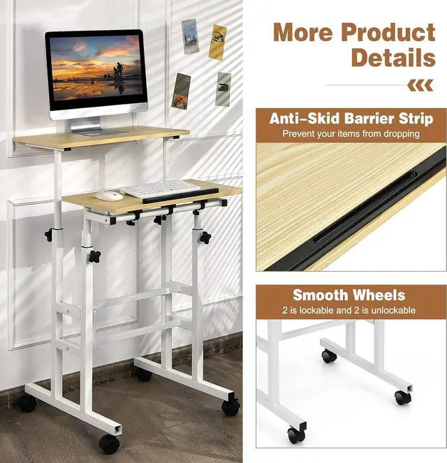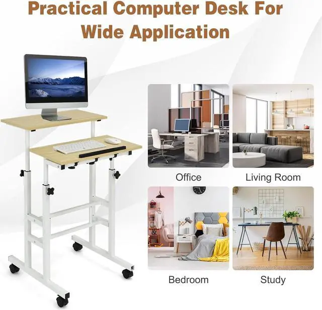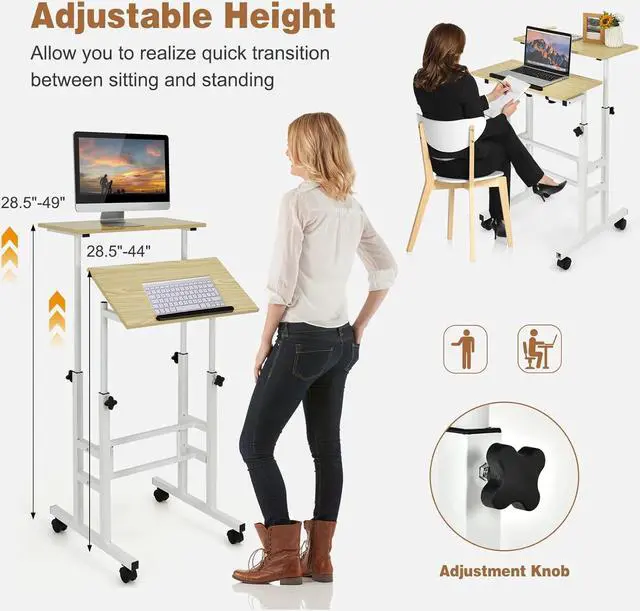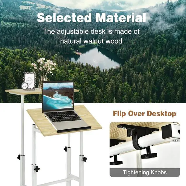 Mobile Standing Desk, Height Adjustable Rolling Laptop Cart w/Tilting Desktop for Standing or Sitting, Lockable Casters, Home Office Computer Workstation for Small Spaces (Natural)