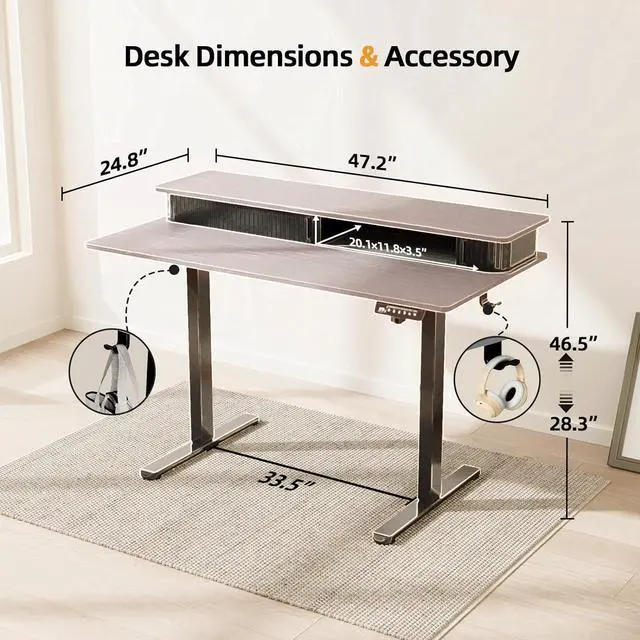 Spacious Work Space: With a 47.2" x 24.8" desktop, this gray standing desk is perfect for tight spaces. The hook on both sides of the table for bags or earphones ensures your desktop has more space for work