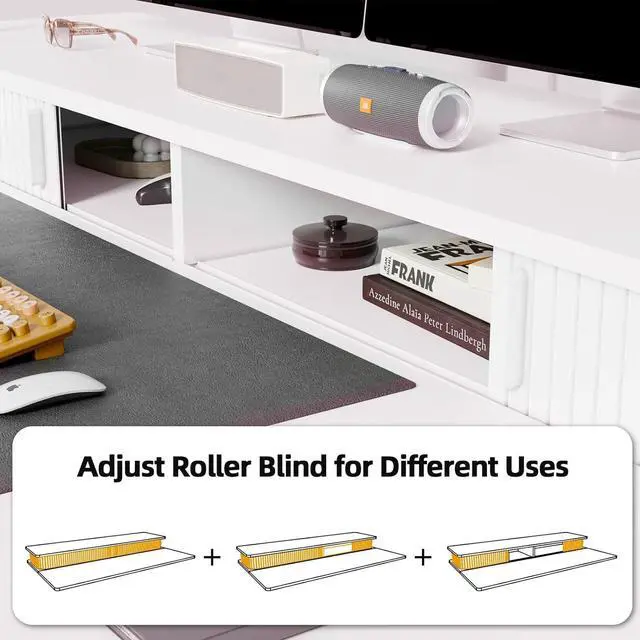Storage Shelves with Sliding Doors: Unique electric stand up desk with roller shutter door design. Provides 2 hidden storage spaces (3.5"H x 20.1"W x11.8"D) to keep your desktop clean and tidy