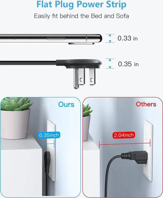 Ultra Flat Plug & Flat Extension Cord: with only 0.35 inch ultra slim design, this flat plug is much thinner than traditional plugs, which can close to the wall easily, and hide behind the furniture. Compared to bulky round line, the 6ft flat extension cord increases the flexibility and durability of the line.