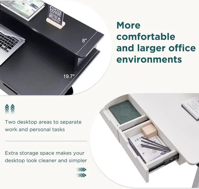 The computer desk has several convenient features. It has built-in power outlets, allowing easy charging of devices such as laptops and smartphones. On both sides of the desk, handy hooks are provided for hanging items, keeping your essentials within reach. The desk also features a 360-degree rotating cup holder, ensuring you can enjoy your beverages without worrying about spills. Additionally, it comes with a keyboard tray, providing a designated space for comfortable typing. Lastly, the desk offers two drawers for storing small items, helping you organize your workspace.