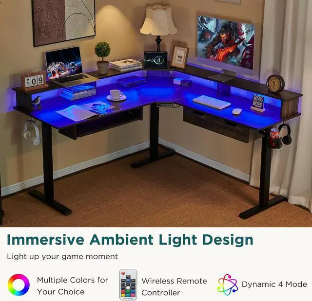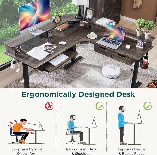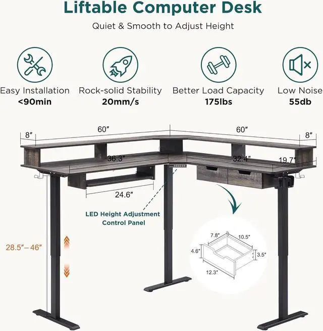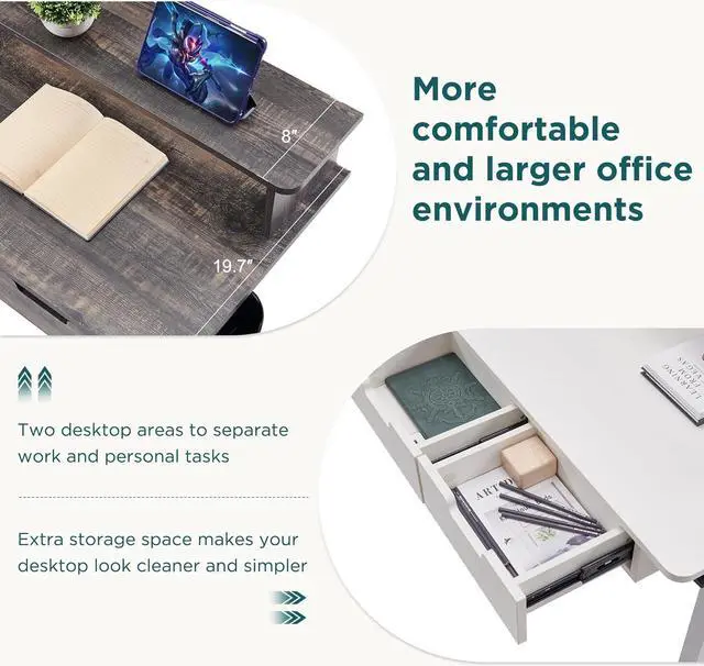 The computer desk has several convenient features. It has built-in power outlets, allowing easy charging of devices such as laptops and smartphones. On both sides of the desk, handy hooks are provided for hanging items, keeping your essentials within reach. The desk also features a 360-degree rotating cup holder, ensuring you can enjoy your beverages without worrying about spills. Additionally, it comes with a keyboard tray, providing a designated space for comfortable typing. Lastly, the desk offers two drawers for storing small items, helping you organize your workspace.