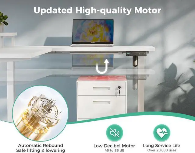 This sit-stand desk features a new generation motor with the following three features: over 20,000 lift times' service life, low noise level of 45-55 decibels, and automatic rebound.