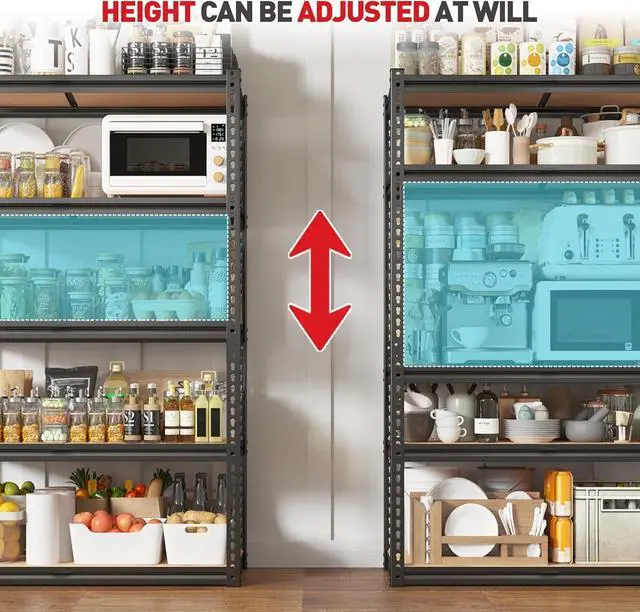 DIY Free Combination & Adjustable Shelving UnitYou can use your imagination to customize your own space. Adjustable 5 tier shelving unit is designed with adjustable connectors. The height of each layer is not only adjustable by moving the crossbar up or down to meet the different heights of varied objects needed, but also divided one shelf into two individual shelves, the link is able to provide more stability.