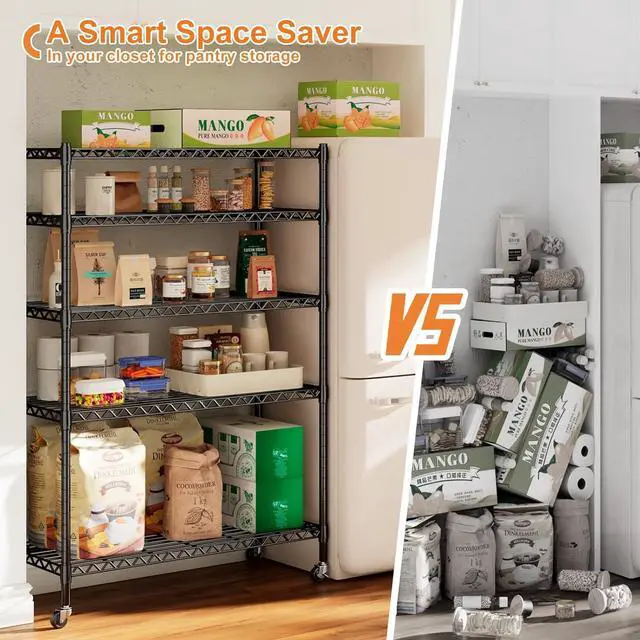 Our rolling shelving is an ideal storage solution for heavy-duty commercial or home storage. The metal shelves for storage, kitchen, bathroom, living room, warehouse, office, industrial or commercial exhibition, hotel, supermarket, etc. It's easy to clean and keep even the heaviest items neat. If you have any issue with the item you purchased, please contact our customer service team, they will definitely assist you with it