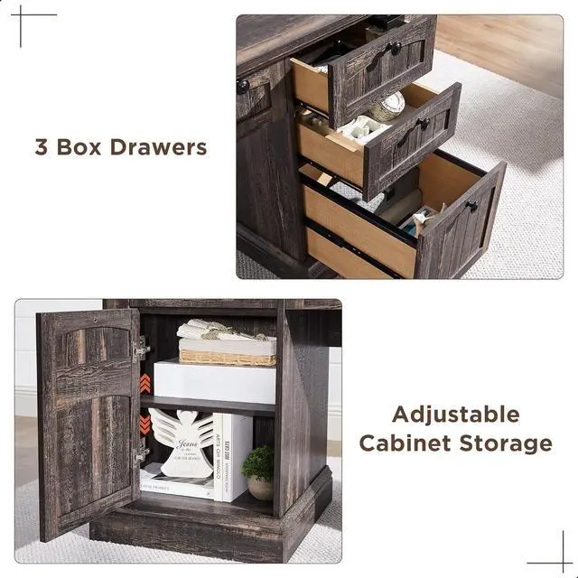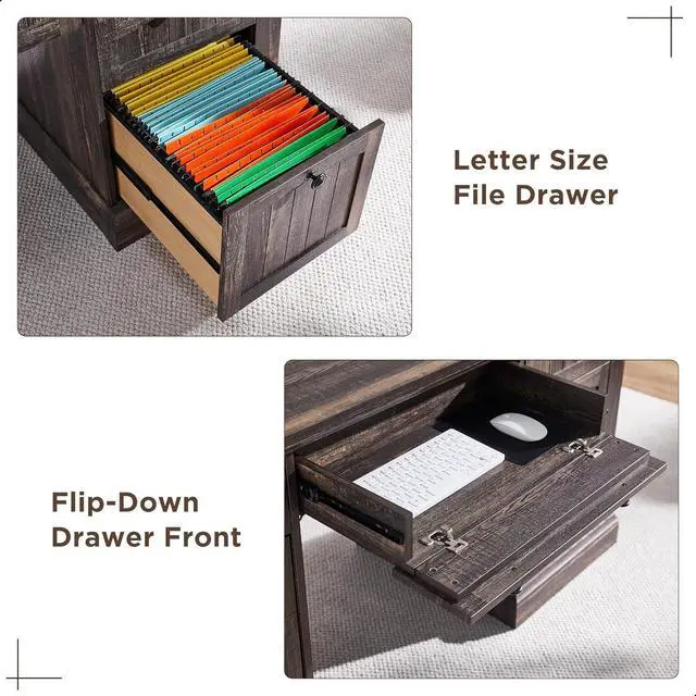 Generous Storage to Keep Your Space Organized The desk includes a large file cabinet that fits letter-size documents, making it easy to organize important paperwork. Additional 3 standard drawers offer plenty of room for office supplies, stationery, and personal items. A storage area behind the door can hold a vertical CPU tower, and an adjustable shelf allows you to customize your credenza with storage.