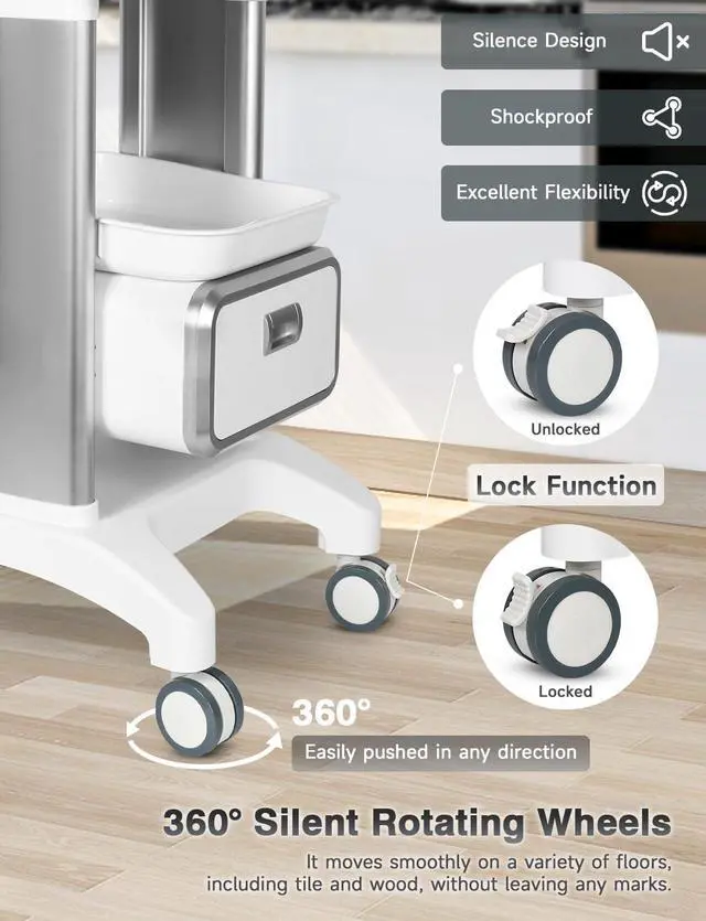 Excellent Maneuverability&Stability: This portable rolling cart is equipped with four silent 360-degree swivel wheels, enabling effortless maneuverability even in tight spaces and enhancing flexibility. Additionally, two wheels come with a locking function, allowing you to secure the cart in place that secures the cart to your desired position for added stability. The silent wheel design ensures smooth movement on various floor types, providing a hassle-free experience.