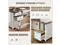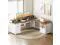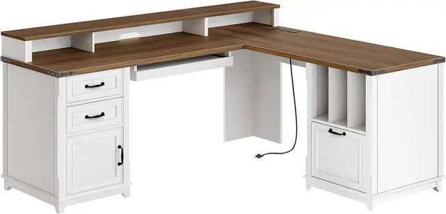 Farmhouse 69" Executive L Shaped Desk with Drawer, Home Office Desk with Charging Station, Corner Computer Desk with Monitor Stand, File Drawer, Storage Cabinet, White and Walnut