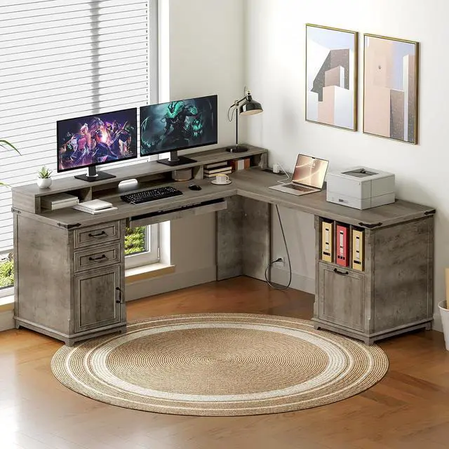 Farmhouse 69" Executive L Shaped Desk with Drawer, Home Office Desk with Charging Station, Corner Computer Desk with Monitor Stand, File Drawer, Storage Cabinet, Grey