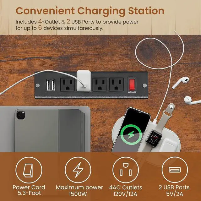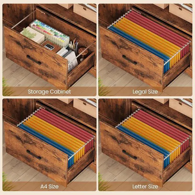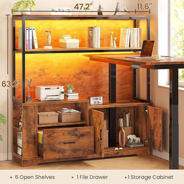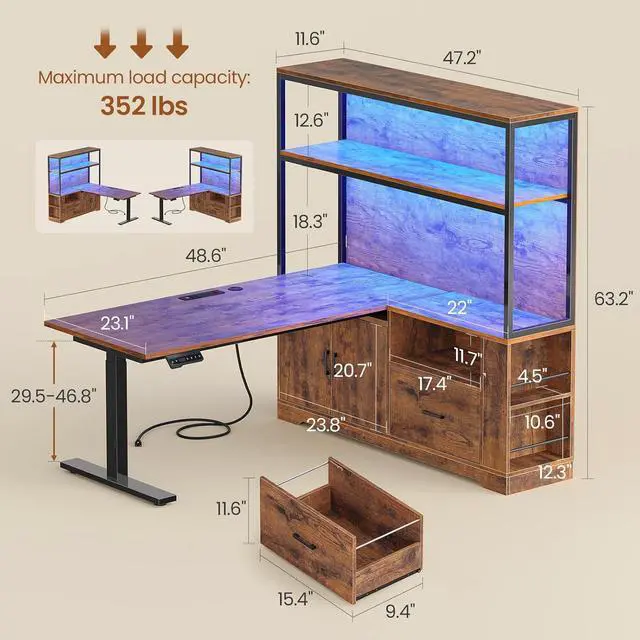 What You Get Create a multifunctional workstation with this L shaped standing desk, equipped with file drawers, bookshelf, storage cabinets, power outlets, 2 LED lights and a lifting motor. And the bookshelf can place left or right for your needs. The L-shaped design maximizes corner space and expands storage capacity.