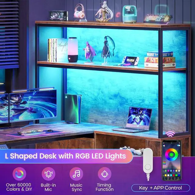Cool & Smart Led Light The gaming desk comes with RGB LED light, remote control via APP, multiple colors and 29 flashing modes for your to choose. Led lights with music sync function, built-in sensitivity adjustable mic, led light color will change with the rhythm of the sound and music. This corner gaming desk can meet you play games for your home offices.