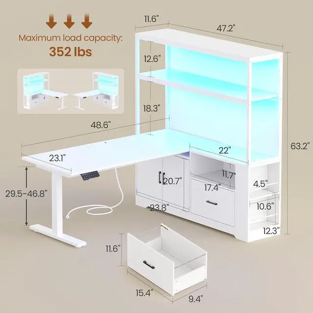 What You Get Create a multifunctional workstation with this L shaped standing desk, equipped with file drawers, bookshelf, storage cabinets, power outlets, 2 LED lights and a lifting motor. And the bookshelf can place left or right for your needs. The L-shaped design maximizes corner space and expands storage capacity.