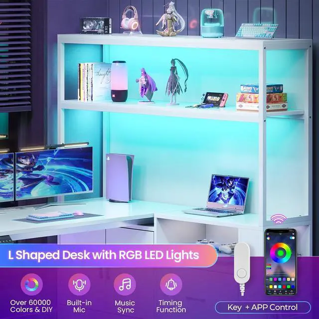 Cool & Smart Led Light The gaming desk comes with RGB LED light, remote control via APP, multiple colors and 29 flashing modes for your to choose. Led lights with music sync function, built-in sensitivity adjustable mic, led light color will change with the rhythm of the sound and music. This corner gaming desk can meet you play games for your home offices.