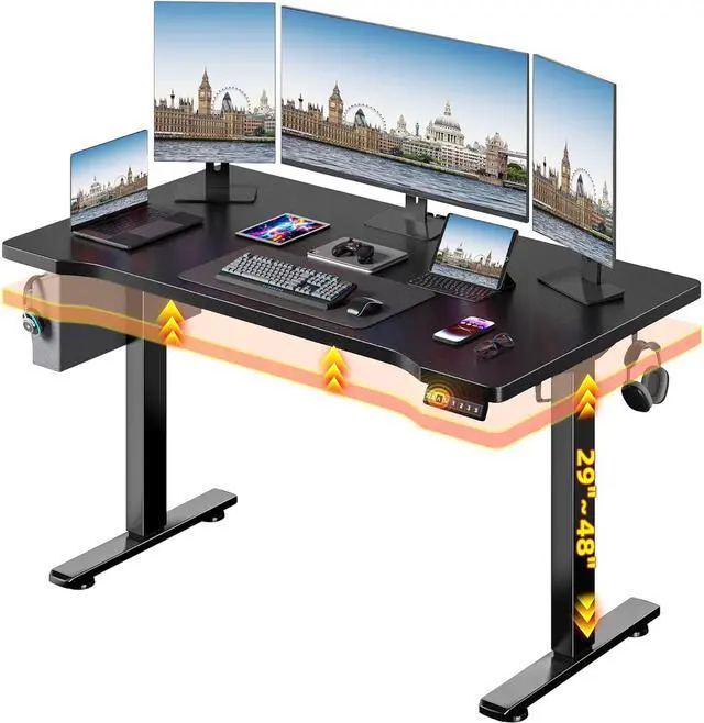 Standing Desk, Inches Stand up Desk with Memory Preset, Adjustable Desks for Work Home Office, Electric Standing Desks, Detachable Side Mount Pocket, Light Strip - Black