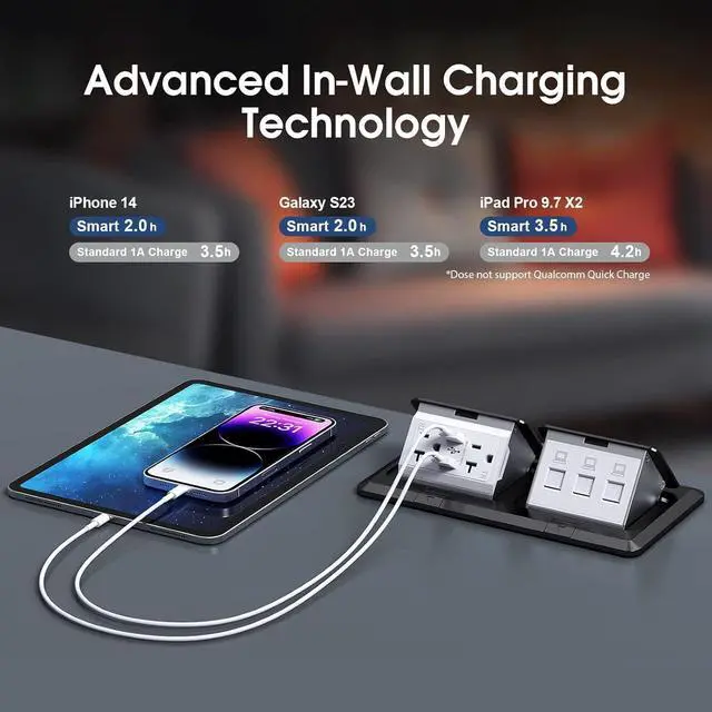 Product composition:The Dual Pop-up Floor Box Kit includes a hard material duplex pop-up floor box, 2*20A tamper resistant receptacle+2*4.8AUSB port.+3*RJ45 Adding dampers makes the product slowly open