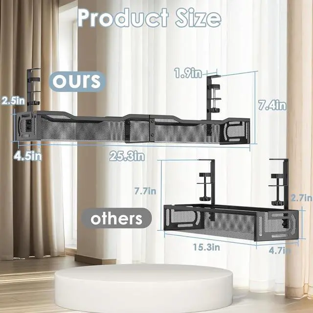 Under Desk Cable Management TrayOur workspace organizers are suitable for the desk within 0.4" to 2" thick. The cord organizer built-in non-slip rubber pads on the clamp to protect the desk surface from scratches. The desk accessories supports both inward and outward installation, you can easily change its position as needed.