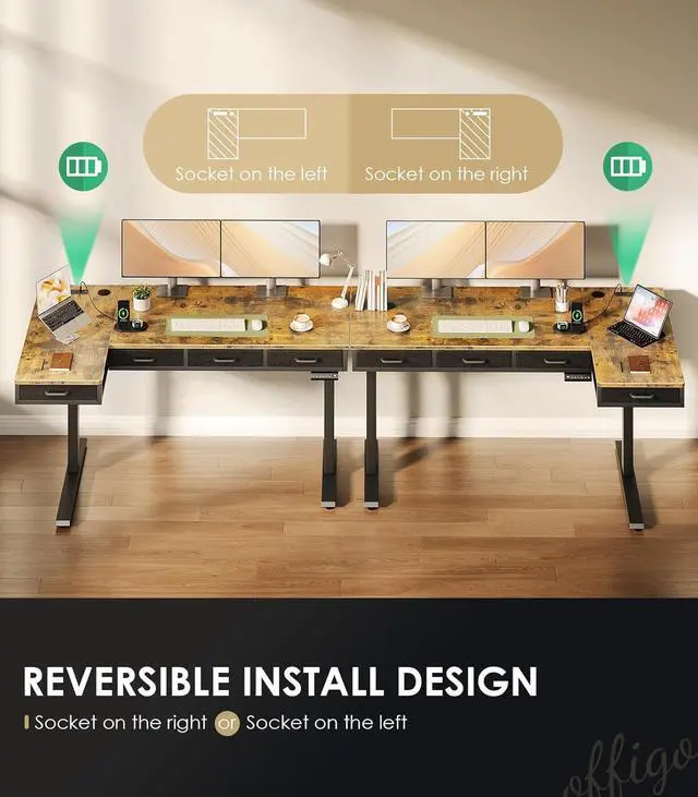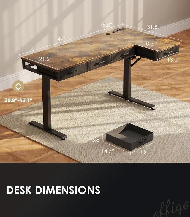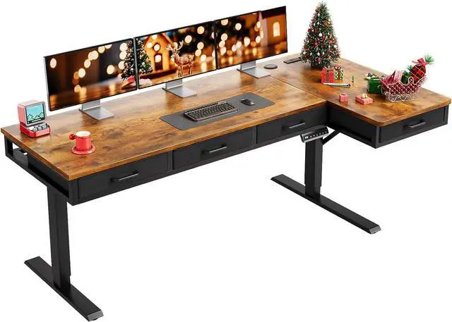 63 Inch L Shaped Electric Standing Desk with Drawers, Height Adjustable Large Desk with Power Outlets, Sit Stand Table, Writing Computer Desk for Home, Office, Workstation, Rustic brown