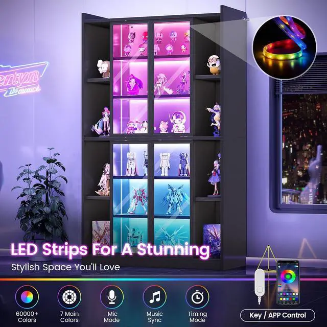 Cool & Smart Led LightThis glass display cabinet is equipped with RGB LED lights, which can be remotely controlled via APP, with more than 60,000 colors and 29 flashing modes for you to choose from. The LED lights have music synchronization function, built-in sensitivity adjustable microphone, and the LED light color will change with the rhythm of sound and music. The light color of the LED can be switched at will according to the scene you use.