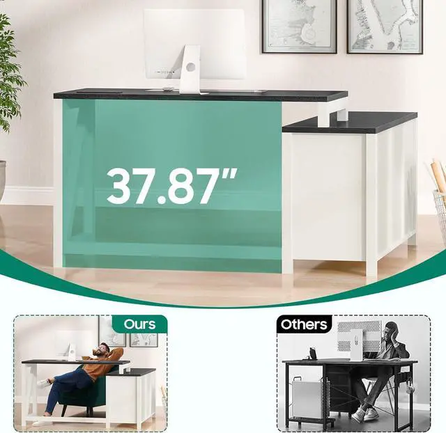 Executive L Shaped Office Desk with Drawers, Farmhouse Corner Desk for Home Office with Storage Cabinet, Computer Desk with Charging Station, Reversible Study Writing Table Workstation, Rustic White