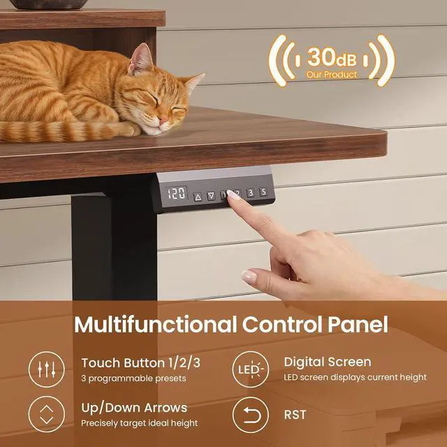 Built to Last with Exceptional StabilityThe industrial-grade steel frame and T-shaped design of the stand up desk support up to 200 lbs. Desktop made of P2 particle board, sturdy durable and anti-scratched. And powered by a robust yet quiet motor (operating at less than 30 DB).