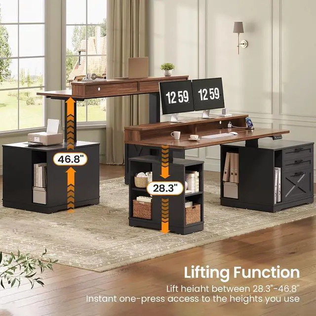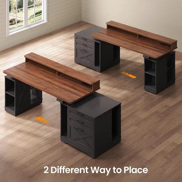 Your Flexible Farmhouse Solution: A Standing Desk Corner for Any Space Adapt your workspace to lifes changes! This clever adjustable desktop standing desk offers two reversible setupssimply configure the shelving and file cabinet unit on the left or right to fit your room layout. Ideal for a cozy bedroom nook, a shared living room office, or a rustic studio, it provides the ultimate flexibility. No more fixed furniture frustrationthis desk grows and changes with your needs, making it the last standing desk youll ever need to buy.