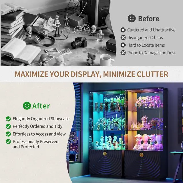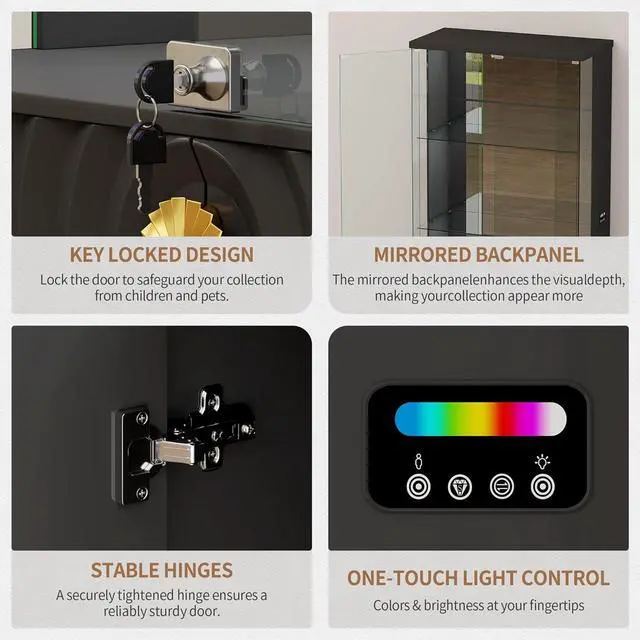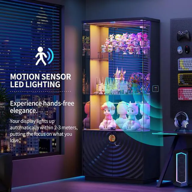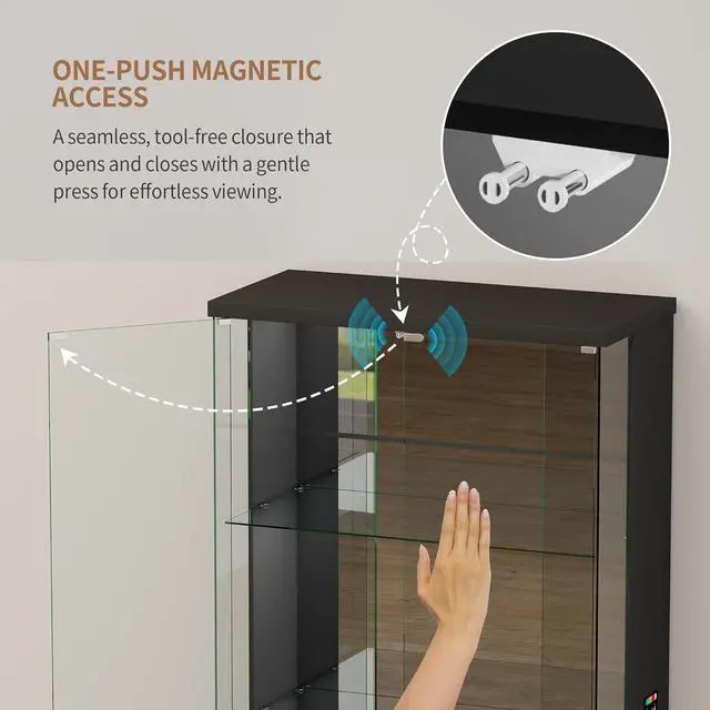 Lockable Pop-Up Glass DoorThe locking tempered glass door offers an unobstructed view of your treasures. The handle-less pop-up design ensures effortless access while adding sleek sophistication, and the built-in locking mechanism ensures your collectibles are always kept safe