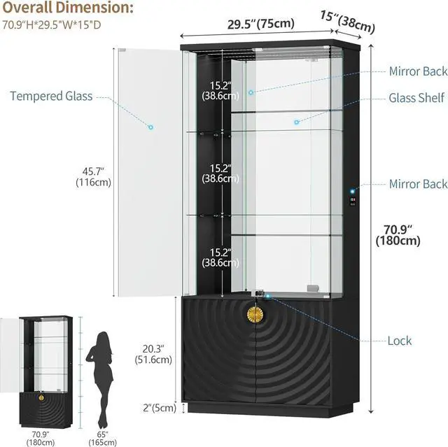 Ample Storage SpaceThis glass storage cabinet has fantastic glass door with a lock, offers 3-tier glass shelves (each with ~15.5" of height) and one bottom cabinet for displaying collectibles, figures, antiques, wine, books and decor pieces. From living rooms and bedrooms to offices