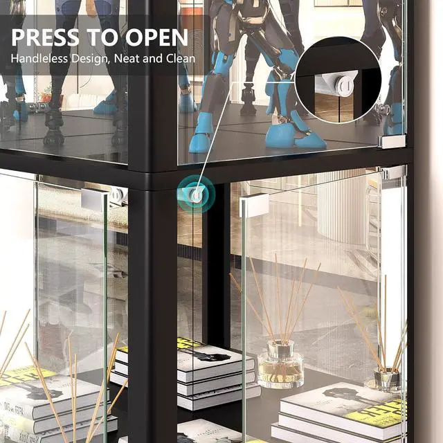 Corner Access with Pop-Up Doors DesignThis corner display case is designed with four clear tempered glass doors that pop open with a gentle press. The double-sided openings make it easy to reach your itemsno matter how the cabinet is positioned. Mirrored back panel visually expands space and adds upscale depth for collectibles, decor, or artwork