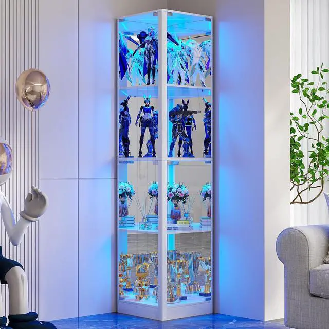 Corner Access with Pop-Up Doors DesignThis corner display case is designed with four clear tempered glass doors that pop open with a gentle press. The double-sided openings make it easy to reach your itemsno matter how the cabinet is positioned. Mirrored back panel visually expands space and adds upscale depth for collectibles, decor, or artwork