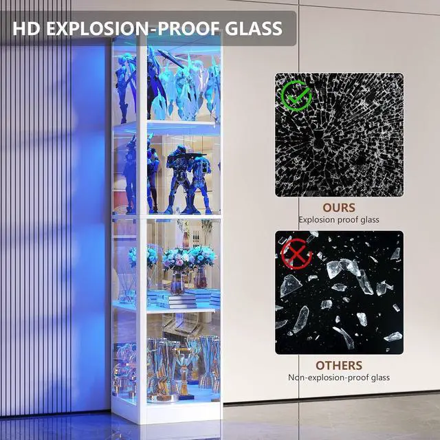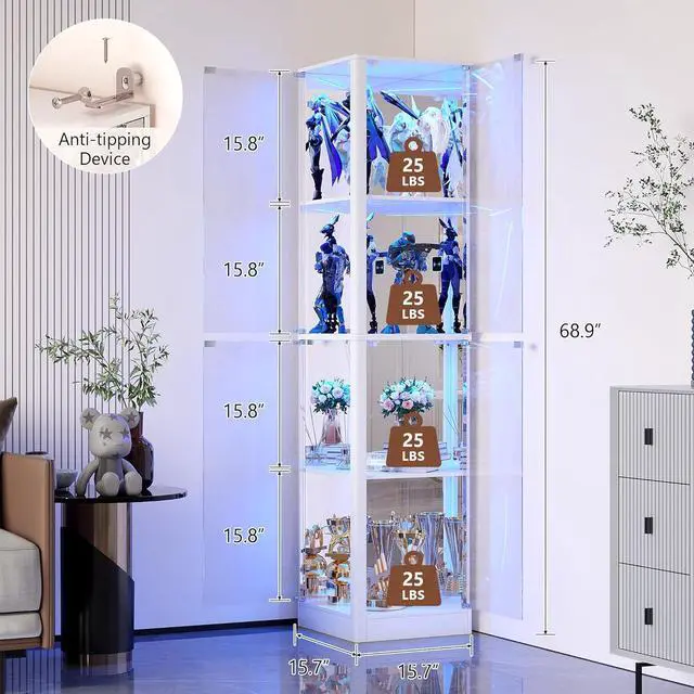 Space-Saving Shape, Generous StorageWith a tall, slim silhouette that tucks neatly into corners, this glass display case makes the most of small spaces. Four sturdy display shelves (15.8" high each) offer ample room for collectibles, toys, books, or decoreach shelf supports up to 25 lbs