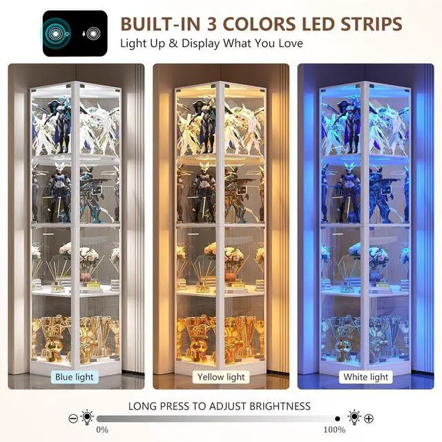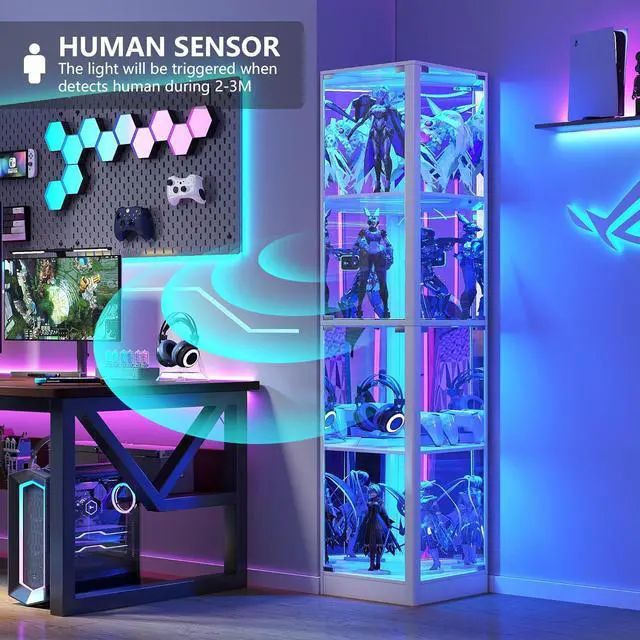 3-Color Motion Sensor LightingBring your treasures to life with adjustable LED lights in warm, cool, and blue tones. The built-in motion sensor lights up as you approach, creating an elegant glow without lifting a fingerperfect for nighttime ambiance or highlighting your collection during gatherings